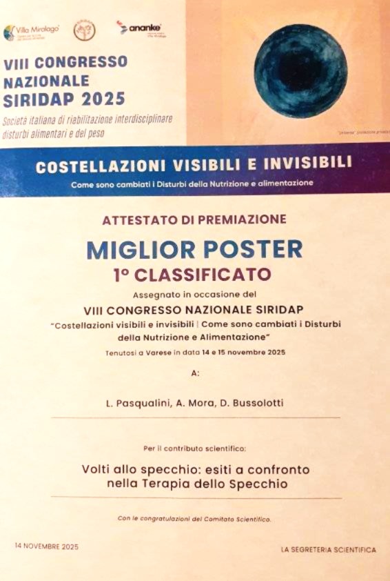 All’edizione 2025 del Congresso Siridap (Società italiana di riabilitazione interdisciplinare disturbi alimentari e del peso), che si è svolta quest’anno a Varese il 14 e 15 novembre, è stato presentato un poster di ricerca dedicato alla terapia dello specchio. Il lavoro è frutto del team multidisciplinare di professionisti della riabilitazione del reparto di Psichiatria Mantova 1: Luca Pasqualini educatore, Andrea Mora dietista, Beatrice Mastrolorenzo psicoterapeutica, con la supervisione di Debora Bussolotti – direttore della struttura complessa di Psichiatria Mantova 1, direttrice scientifica progetto DNA.